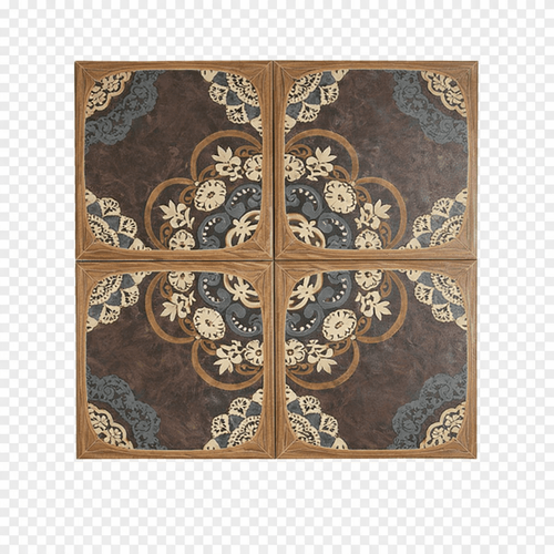 The dark, soulful centerpiece of the collection. This 300*300mm art tile features an intricate, textile-inspired lace pattern set against a deep charcoal and umber base. Its unique integrated wood-style border creates a sophisticated "framed" effect, perfect for designing a luxurious, gallery-like feature wall or a moody kitchen backsplash.